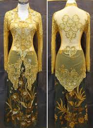 kebaya jawa yang berwrna kuning emas. Dan bercorak kain batik menyerlah kn lg adat kemelayuannya.